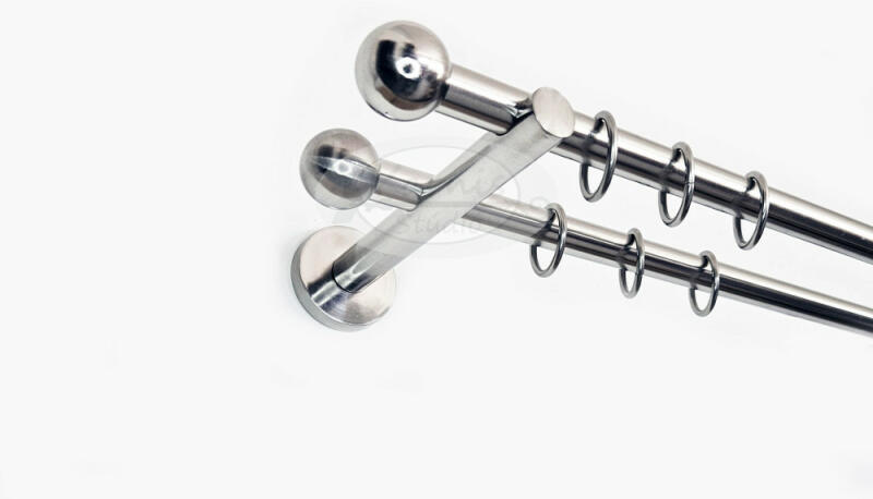 A LONDON 2 rudas, 240 cm-es, inox színű fém karnis szett tartalma: 2 db 240 cm-e fényes inox színű fém karnisrúd 4 db London (kis gömb formájú) fém karnis végzáró 3 db falra szerelhető fém konzol 48 db fém függönykarika műanyag ráncszedő kampóval