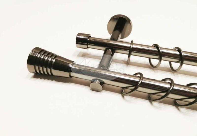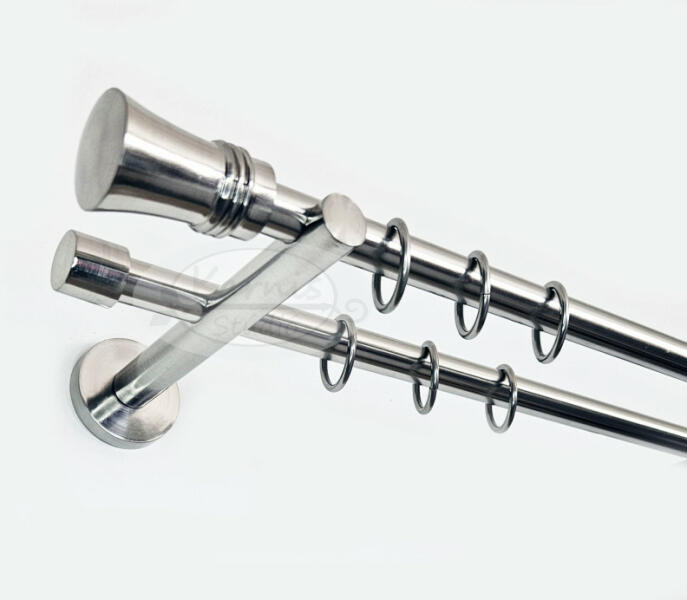 A ROTTERDAM 2 rudas, 200 cm-es, inox színű fém karnis szett tartalma: 2 db 200 cm-e fényes inox színű fém karnisrúd 2 db Rotterdam fém karnis végzáró 2 db Varsó (kis kupak formájú) fém karnis végzáró 2 db falra szerelhető fém konzol 40 db fém függönykarika műanyag ráncszedő kampóval