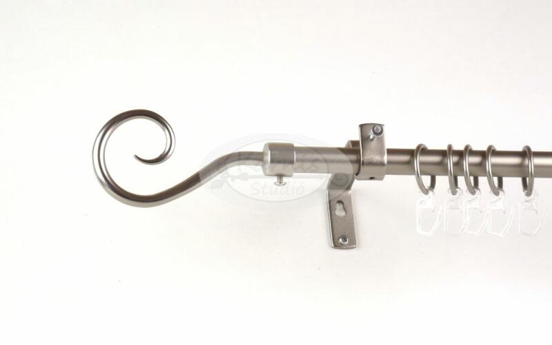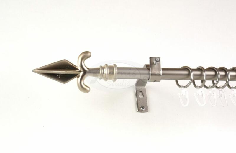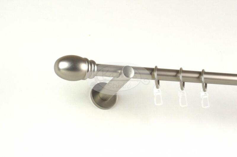 A ST. LOUIS 160 cm-es nikkel-matt színű 1 rudas, modern tartós fém karnis szett tartalma: 1 db 160 cm-es nikkel-matt színű 16 mm átmérőjű fém karnisrúd 2 db St. Louis típusú nikkel-matt színű végzáró 2 db falra szerelhető modern fém konzol 16 db fém karika műanyag ráncszedő kampóval
