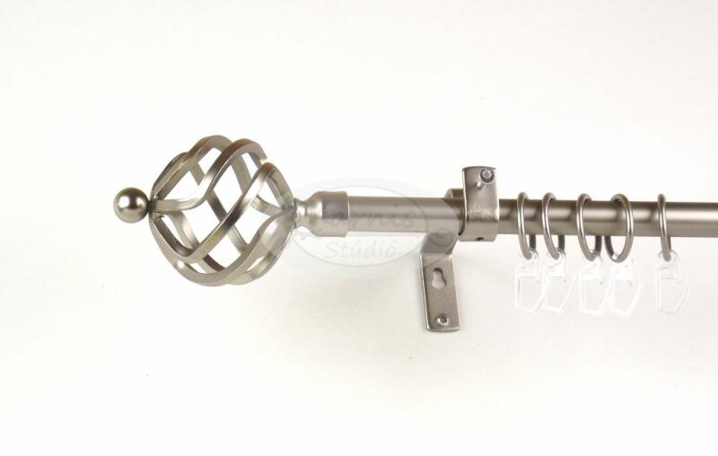 A KECSKEMÉT 240 cm-es nikkel-matt színű 2 rudas fém karnis szett tartalma: 2 db 240 cm-es nikkel-matt színű 16 mm átmérőjű fém karnisrúd 2 db Kecskemét típusú nikkel-matt színű fém karnis végzáró 2 db Veszprém típusú, kis gömb formájú fém karnis végzáró 3 db falra szerelhető, modern fém konzol 48 db fém karika műanyag ráncszedő kampóval