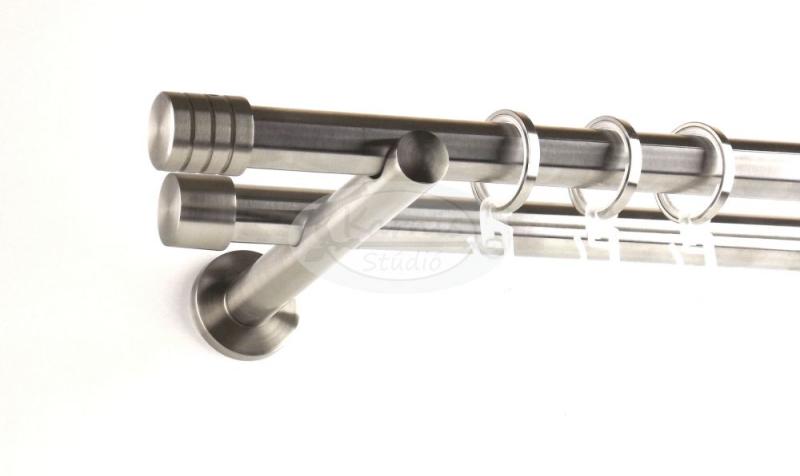 A ST. LOUIS 240 cm-es nikkel-matt színű 2 rudas fém karnis szett tartalma: 2 db 240 cm-es nikkel-matt színű 16 mm átmérőjű fém karnisrúd 2 db St. Louis nikkel-matt színű fém karnis végzáró 2 db Kansas típusú, kis kupak formájú fém karnis végzáró 3 db falra szerelhető, modern fém konzol 48 db fém karika műanyag ráncszedő kampóval