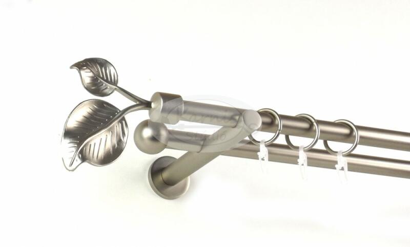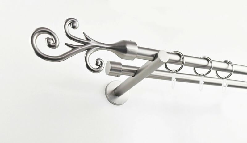 A DETROIT 200 cm-es nikkel-matt színű 2 rudas fém karnis szett tartalma: 2 db 200 cm-es nikkel-matt színű 16 mm átmérőjű fém karnisrúd 2 db Detroit típusú nikkel-matt színű fém karnis végzáró 2 db Kansas típusú, kis kupak formájú fém karnis végzáró 2 db falra szerelhető, modern fém konzol 40 db fém karika műanyag ráncszedő kampóval