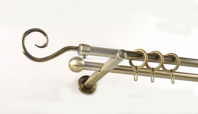 A SOPRON óarany színű, 300 cm-es, 2 rudas, modern tartós fém karnis szett tartalma: 2 db 300 cm-es óarany fém karnisrúd 2 db Sopron típusú óarany színű fém végzáró 2 db Veszprém típusú kis gömb végzáró 3 db falra szerelhető modern fém konzol 60 db óarany színű műanyag karika ráncszedő kampóval