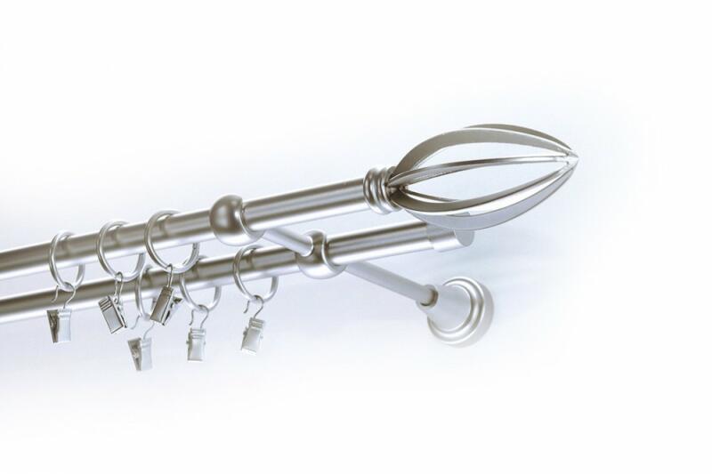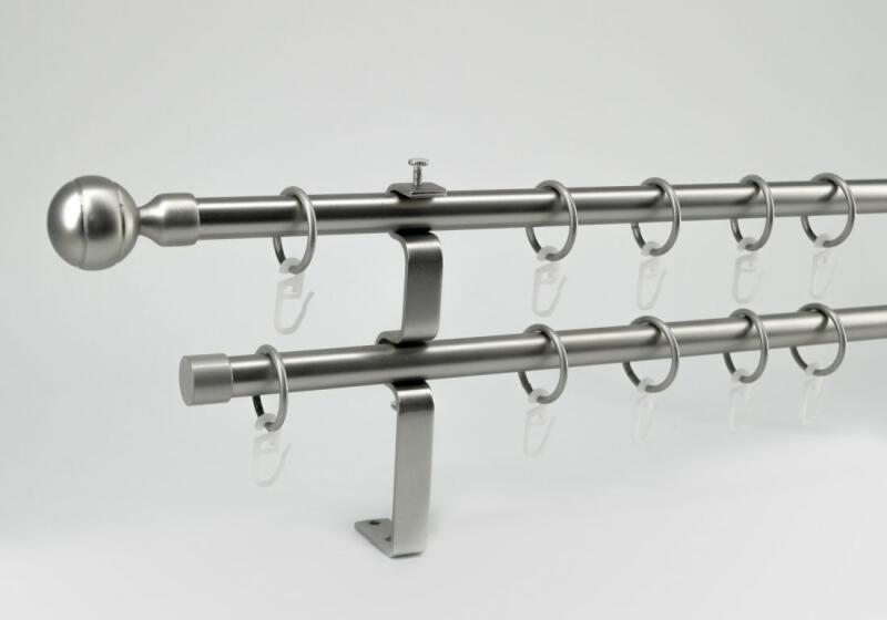 A szett tartalma: - 2 db nikkel-matt színű 16 mm Ø rúd a választott méretben - 2 db nikkel-matt New Orleans végzáró (5 cm) - 2 db nikkel- matt Kansas végzáró (2 cm)- a hátsó rúdra - 2 db dupla nikkel-matt lapostartó (8,5/14,5 cm) - nikkel-matt karikák ráncszedőkampóval (rudanként, 10 cm-ként 1 db) - a szereléshez szükséges csavarok és tiplik 240 cm karnishossz felett 3 db