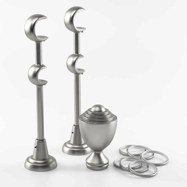 A függönykarnisszett tartalma: - 1 db nikkel-matt színű 25 mm Ø karnisrúd a választott méretben - 2 db nikkel-matt Wels függönykarnis végzáró ( 11 cm) - 2 db szimpla nikkel-matt nyitott tartókonzol (12-18 cm- állítható faltáv) - nikkel-matt karikák és ráncszedő kampók (10 cm-ként 1 db) - a szereléshez szükséges csavarok és tiplik 240 cm karnishossz felett 3 db tartókon