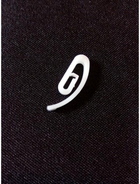 Fehér színű műanyag függönyhorog. A horog segítségével a függönyt a csúszkára, görgőre akaszthatjuk. A horog kb. : 2,7 cm hosszú.