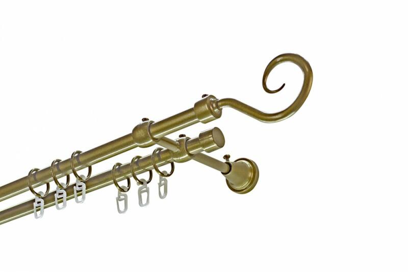 A szett tartalma: - 2 db óarany színű 19 mm Ø rúd a választott méretben - 2 db óarany Monaco végzáró (5,5 cm) - 2 db óarany Köln végzáró (2 cm)- a hátsó rúdra - 2 db dupla óarany nyitott tartó (11/17 cm) - óarany karikák ráncszedőkampóval (rudanként, 10 cm-ként 1 db) - a szereléshez szükséges csavarok és tiplik 240 cm karnishossz felett 3 db tartót tartalmaz a csom