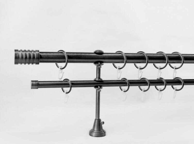 A szett tartalma: - 1 db titán színű 25 mm Ø rúd a választott méretben - 1 db titán színű 16 mm Ø rúd a választott méretben (hátsó rúd) - 2 db titán Odessa végzáró (8 cm) - 2 db titán Kansas végzáró (2 cm)- a hátsó rúdra - 2 db dupla titán nyitott tartó (12,5/19 cm) - titán karikák és ráncszedő kampók (rudanként, 10 cm-ként 1 db) - a szereléshez szükséges c
