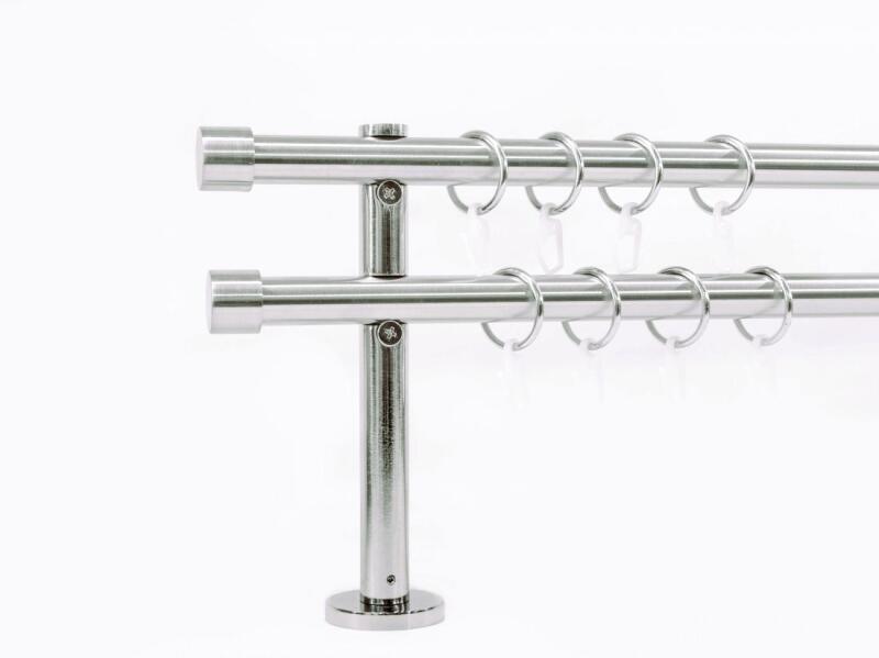 A szett tartalma: - 2 db inox színű 19 mm Ø rúd a választott méretben - 2 db inox Köln végzáró (2 cm) - 2 db inox Köln végzáró (2 cm)- a hátsó rúdra - 2 db dupla inox block tartó (12/18 cm) - inox karikák ráncszedőkampóval (rudanként, 10 cm-ként 1 db) - a szereléshez szükséges csavarok és tiplik 240 cm karnishossz felett 3 db tartót tartalmaz a csomag. Webáruházunkba