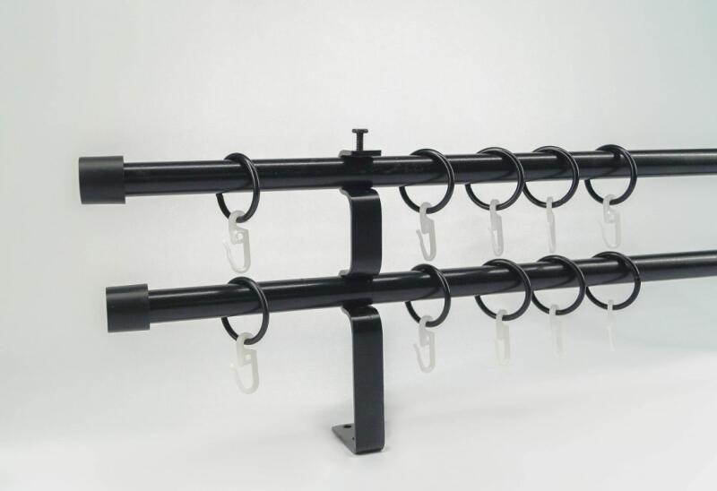 A szett tartalma: - 2 db fekete színű 16 mm Ø rúd a választott méretben - 2 db fekete Kansas végzáró (2 cm) - 2 db fekete Kansas végzáró (2 cm)- a hátsó rúdra - 2 db dupla fekete lapostartó (8,5/14,5 cm) - fekete karikák és ráncszedő kampók (rudanként, 10 cm-ként 1 db) - a szereléshez szükséges csavarok és tiplik 240 cm karnishossz felett 3 db tartót tartalmaz a csomag.