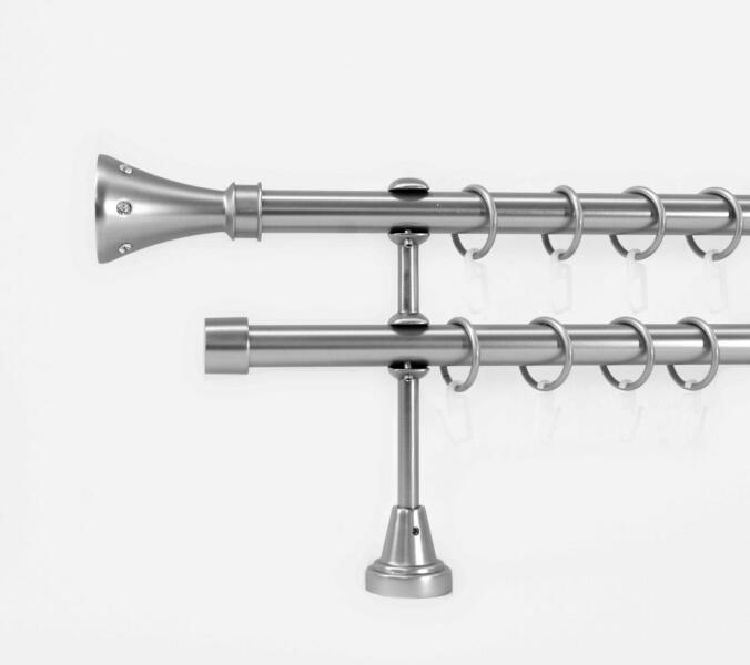 A szett tartalma: - 2 db nikkel-matt színű 19 mm Ø rúd a választott méretben - 2 db nikkel-matt Split végzáró (7 cm) - 2 db nikkel- matt Köln végzáró (2 cm)- a hátsó rúdra - 2 db dupla nikkel-matt nyitott tartó (11/17 cm) - nikkel-matt karikák ráncszedőkampóval (rudanként, 10 cm-ként 1 db) - a szereléshez szükséges csavarok és tiplik 240 cm karnishossz felett 3 db tartó
