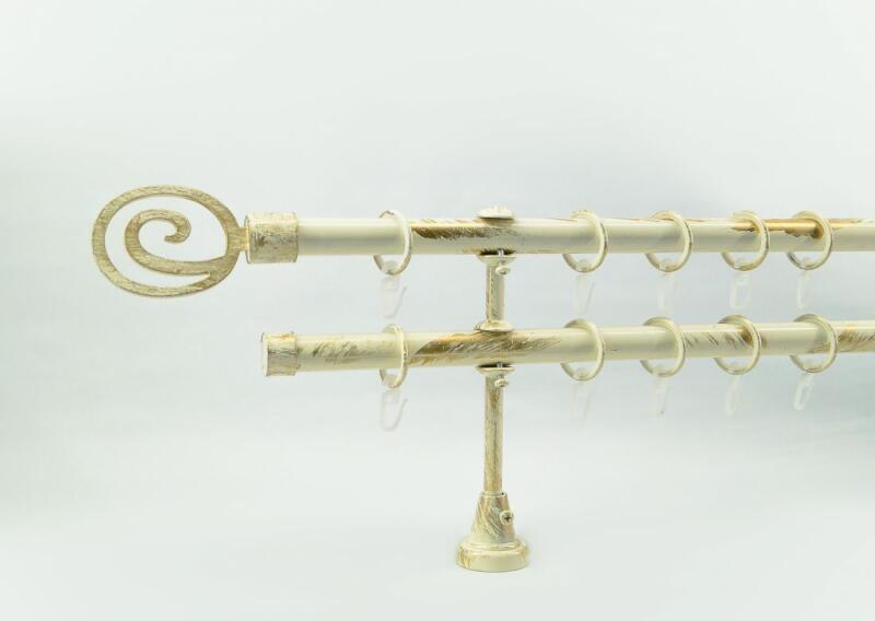 A szett tartalma: - 2 db ecrü-gold színű 19 mm Ø rúd a választott méretben - 2 db ecrü-gold Florenz végzáró (10 cm) - 2 db ecrü-gold Arezzo végzáró (2 cm)- a hátsó rúdra - 2 db dupla ecrü-gold nyitott tartó (12/18 cm) - ecrü-gold karikák ráncszedőkampóval (rudanként, 10 cm-ként 1 db) - a szereléshez szükséges csavarok és tiplik 240 cm karnishossz felett 3 db tartót