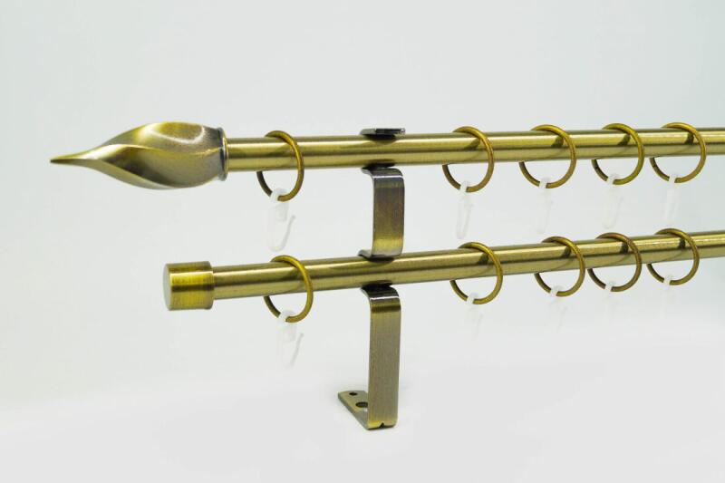 A szett tartalma: - 2 db óarany színű 16 mm Ø rúd a választott méretben - 2 db óarany Atlanta végzáró (8,5 cm) - 2 db óarany Kansas végzáró (2 cm)- a hátsó rúdra - 2 db dupla óarany lapostartó (8,5/14,5 cm) - óarany karikák és ráncszedő kampók (rudanként, 10 cm-ként 1 db) - a szereléshez szükséges csavarok és tiplik 240 cm karnishossz felett 3 db tartót tartalmaz a