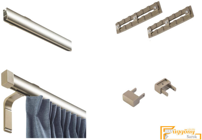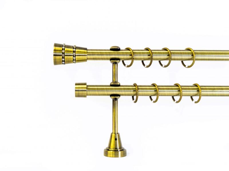 A szett tartalma: - 2 db óarany színű 19 mm Ø rúd a választott méretben - 2 db óarany Monaco végzáró (5,5 cm) - 2 db óarany Köln végzáró (2 cm)- a hátsó rúdra - 2 db dupla óarany nyitott tartó (11/17 cm) - óarany karikák ráncszedőkampóval (rudanként, 10 cm-ként 1 db) - a szereléshez szükséges csavarok és tiplik 240 cm karnishossz felett 3 db tartót tartalmaz a csom