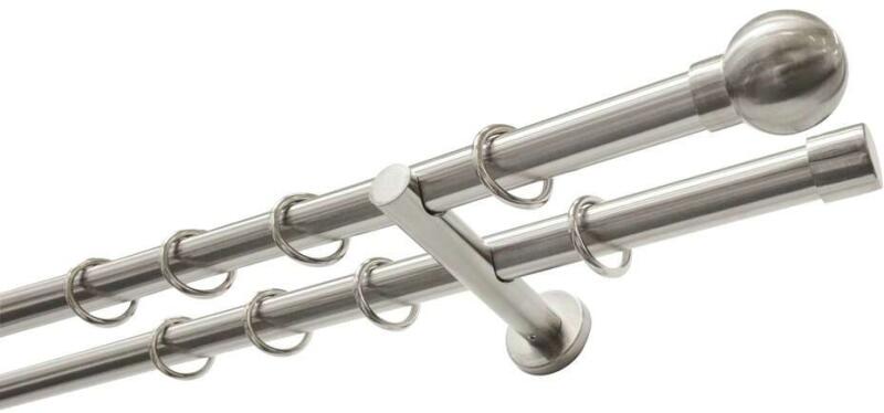 Fém karnis garnitúra 2 soros 20mm Gömb 200cm nemesacél - Kétsoros 20mm átmérőjű, nemesacél színű minőségi rúdkarnis szett, kompletten minden tartozékával. A csomag tartalmazza a tartókat, karikákat, akasztókat, és a végfejeket.
