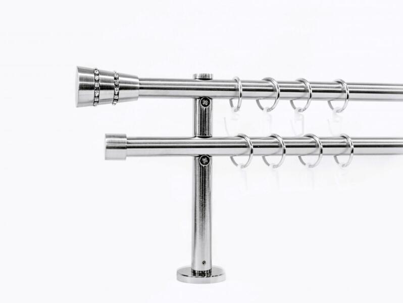 A szett tartalma: - 2 db inox színű 19 mm Ø rúd a választott méretben - 2 db inox Monaco végzáró (5,5 cm) - 2 db inox Köln végzáró (2 cm)- a hátsó rúdra - 2 db dupla inox block tartó (12/18 cm) - inox karikák ráncszedőkampóval (rudanként, 10 cm-ként 1 db) - a szereléshez szükséges csavarok és tiplik 240 cm karnishossz felett 3 db tartót tartalmaz a csomag. Webáruházun