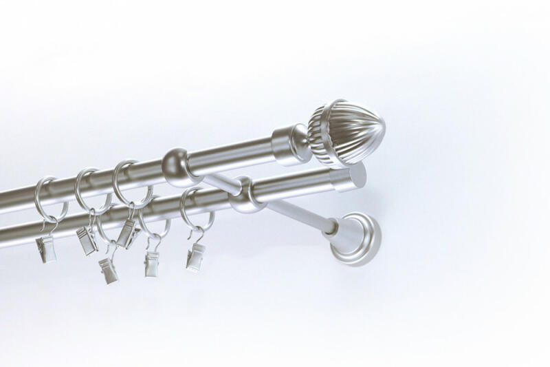 A szett tartalma: - 2 db nikkel-matt színű 16 mm Ø rúd a választott méretben - 2 db nikkel-matt Kansas végzáró (2 cm) - 2 db nikkel- matt Kansas végzáró (2 cm)- a hátsó rúdra - 2 db dupla nikkel-matt block tartó (8/14 cm) - nikkel-matt karikák ráncszedőkampóval (rudanként, 10 cm-ként 1 db) - a szereléshez szükséges csavarok és tiplik 240 cm karnishossz felett 3 db tartót