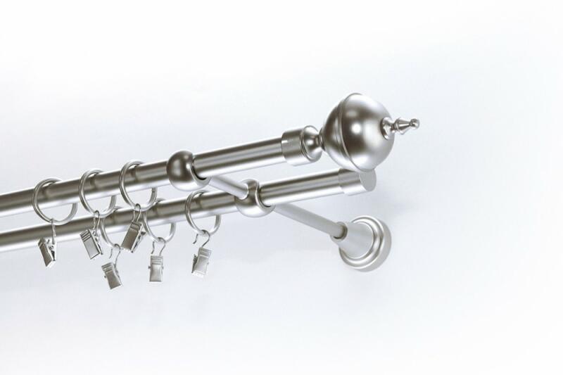 A szett tartalma: - 2 db nikkel-matt színű 16 mm Ø rúd a választott méretben - 2 db nikkel-matt Sopron végzáró (12 cm) - 2 db nikkel- matt Kansas végzáró (2 cm)- a hátsó rúdra - 2 db dupla nikkel-matt block tartó (8/14 cm) - nikkel-matt karikák ráncszedőkampóval (rudanként, 10 cm-ként 1 db) - a szereléshez szükséges csavarok és tiplik 240 cm karnishossz felett 3 db tartó