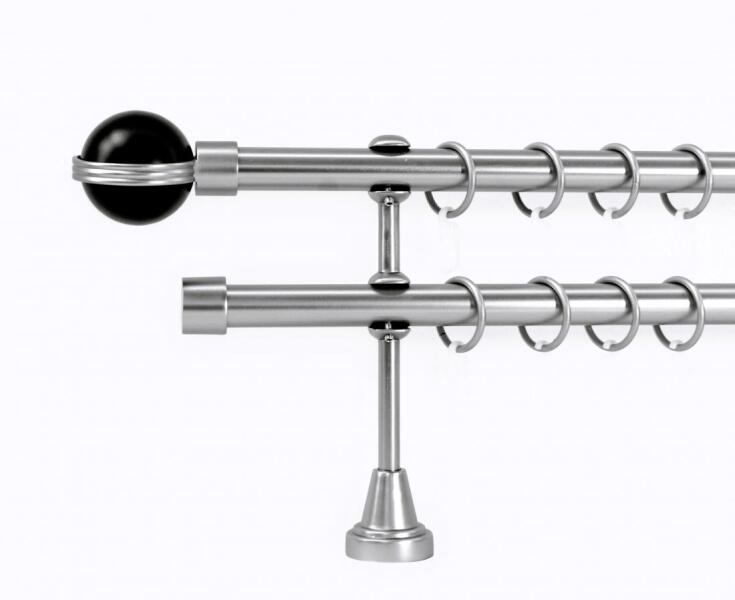 A szett tartalma: - 2 db nikkel-matt színű 19 mm Ø rúd a választott méretben - 2 db nikkel-matt Lublin végzáró (7 cm) - 2 db nikkel- matt Köln végzáró (2 cm)- a hátsó rúdra - 2 db dupla nikkel-matt nyitott tartó (11/17 cm) - nikkel-matt karikák ráncszedőkampóval (rudanként, 10 cm-ként 1 db) - a szereléshez szükséges csavarok és tiplik 240 cm karnishossz felett 3 db tart