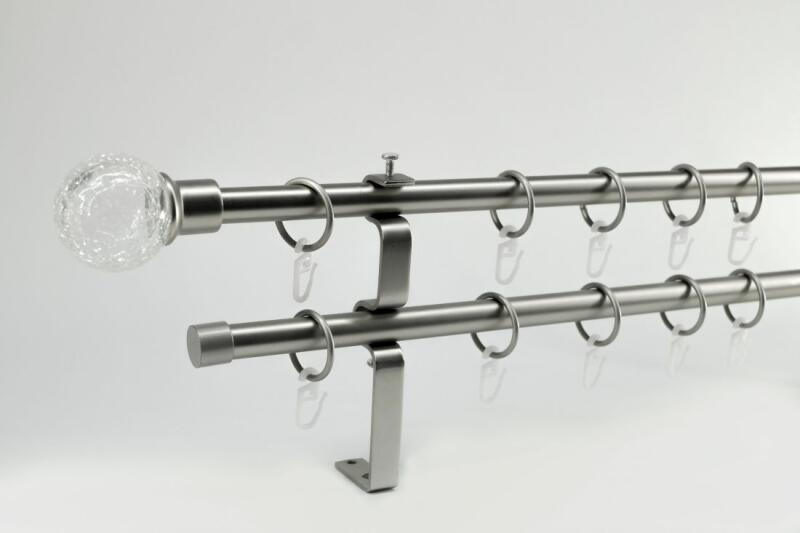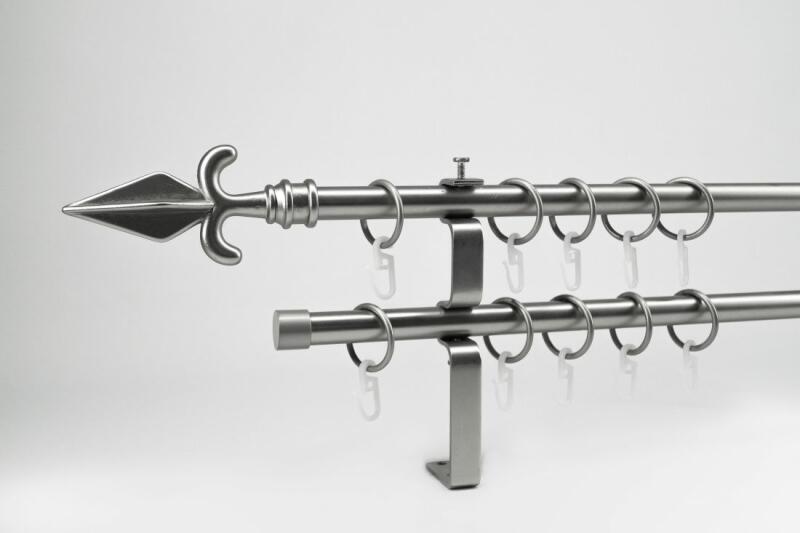 A szett tartalma: - 2 db nikkel-matt színű 16 mm Ø rúd a választott méretben - 2 db nikkel-matt Glasgow végzáró (7 cm) - 2 db nikkel- matt Kansas végzáró (2 cm)- a hátsó rúdra - 2 db dupla nikkel-matt lapostartó (8,5/14,5 cm) - nikkel-matt karikák ráncszedőkampóval (rudanként, 10 cm-ként 1 db) - a szereléshez szükséges csavarok és tiplik 240 cm karnishossz felett 3 db tar