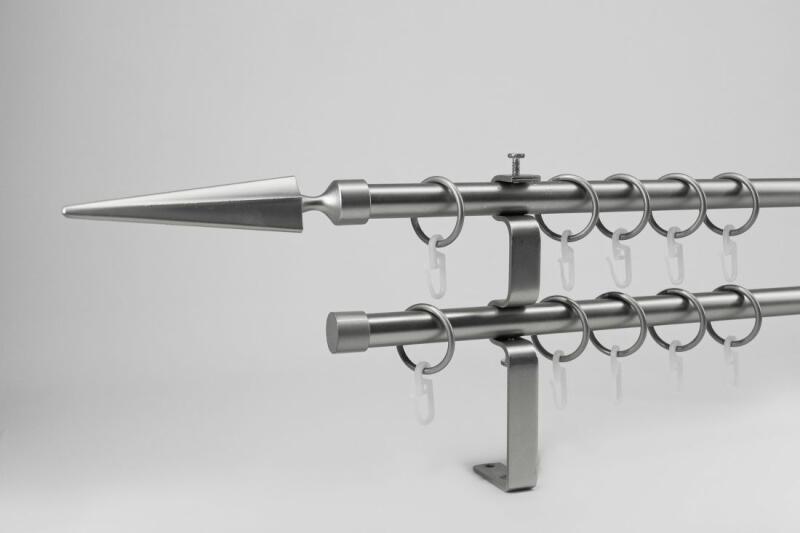 A szett tartalma: - 2 db nikkel-matt színű 16 mm Ø rúd a választott méretben - 2 db nikkel-matt Tata végzáró (13 cm) - 2 db nikkel- matt Kansas végzáró (2 cm)- a hátsó rúdra - 2 db dupla nikkel-matt block tartó (8/14 cm) - nikkel-matt karikák ráncszedőkampóval (rudanként, 10 cm-ként 1 db) - a szereléshez szükséges csavarok és tiplik 240 cm karnishossz felett 3 db tartót