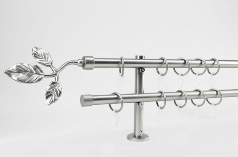 A szett tartalma: - 2 db nikkel-matt színű 16 mm Ø rúd a választott méretben - 2 db nikkel-matt St. Louis végzáró (5 cm) - 2 db nikkel- matt Kansas végzáró (2 cm)- a hátsó rúdra - 2 db dupla nikkel-matt nyitott tartó (11,5/17,5 cm) - nikkel-matt karikák ráncszedőkampóval (rudanként, 10 cm-ként 1 db) - a szereléshez szükséges csavarok és tiplik 240 cm karnishossz felett 3