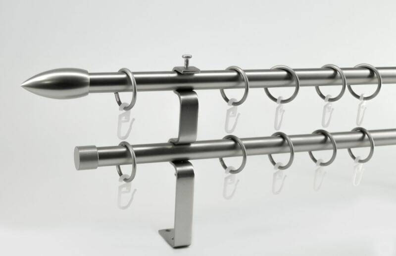 A szett tartalma: - 2 db nikkel-matt színű 16 mm Ø rúd a választott méretben - 2 db nikkel-matt Memphis végzáró (5,5 cm) - 2 db nikkel- matt Kansas végzáró (2 cm)- a hátsó rúdra - 2 db dupla nikkel-matt lapostartó (8,5/14,5 cm) - nikkel-matt karikák ráncszedőkampóval (rudanként, 10 cm-ként 1 db) - a szereléshez szükséges csavarok és tiplik 240 cm karnishossz felett 3 db t