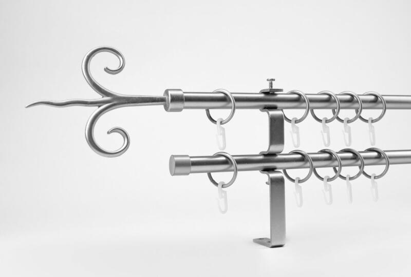 A szett tartalma: - 2 db nikkel-matt színű 16 mm Ø rúd a választott méretben - 2 db nikkel-matt Houston végzáró (10 cm) - 2 db nikkel- matt Kansas végzáró (2 cm)- a hátsó rúdra - 2 db dupla nikkel-matt nyitott tartó (11,5/17,5 cm) - nikkel-matt karikák ráncszedőkampóval (rudanként, 10 cm-ként 1 db) - a szereléshez szükséges csavarok és tiplik 240 cm karnishossz felett 3 d
