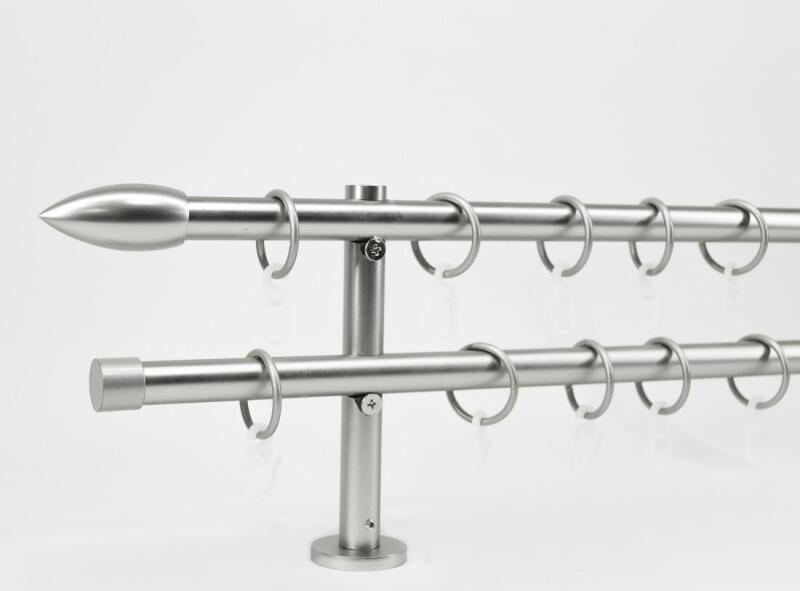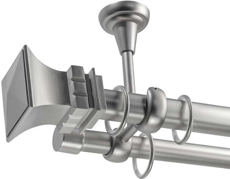 A szett tartalma: - 2 db nikkel-matt színű 16 mm Ø rúd a választott méretben - 2 db nikkel-matt Memphis végzáró (5,5 cm) - 2 db nikkel- matt Kansas végzáró (2 cm)- a hátsó rúdra - 2 db dupla nikkel-matt block tartó (8/14 cm) - nikkel-matt karikák ráncszedőkampóval (rudanként, 10 cm-ként 1 db) - a szereléshez szükséges csavarok és tiplik 240 cm karnishossz felett 3 db tart