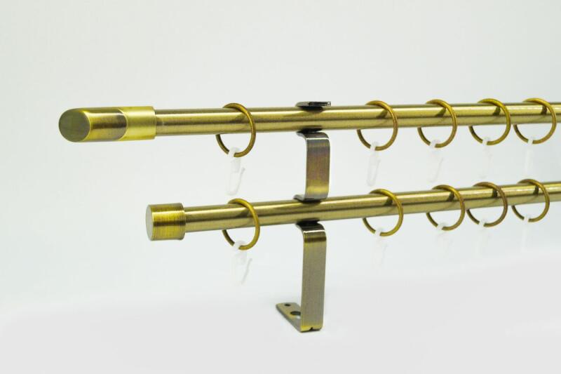 A szett tartalma: - 2 db óarany színű 16 mm Ø rúd a választott méretben - 2 db óarany Leeds végzáró (5,5 cm) - 2 db óarany Kansas végzáró (2 cm)- a hátsó rúdra - 2 db dupla óarany lapostartó (8,5/14,5 cm) - óarany karikák és ráncszedő kampók (rudanként, 10 cm-ként 1 db) - a szereléshez szükséges csavarok és tiplik 240 cm karnishossz felett 3 db tartót tartalmaz a c