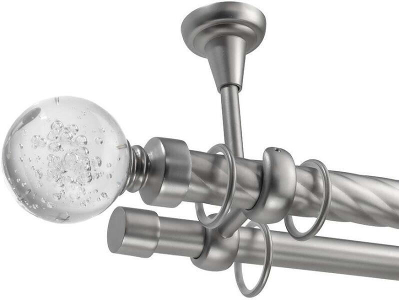 A szett tartalma: - 2 db nikkel-matt színű 16 mm Ø rúd a választott méretben - 2 db nikkel-matt New Orleans végzáró (5 cm) - 2 db nikkel- matt Kansas végzáró (2 cm)- a hátsó rúdra - 2 db dupla nikkel-matt nyitott tartó (11,5/17,5 cm) - nikkel-matt karikák ráncszedőkampóval (rudanként, 10 cm-ként 1 db) - a szereléshez szükséges csavarok és tiplik 240 cm karnishossz felett