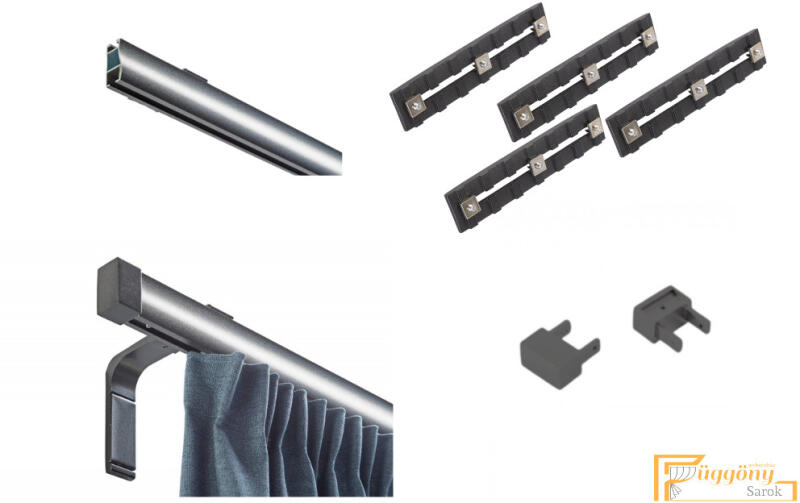 A szett tartalma: - 1 db titán színű 25 mm Ø rúd a választott méretben - 1 db titán színű 16 mm Ø rúd a választott méretben (hátsó rúd) - 2 db titán Bursa végzáró (8 cm) - 2 db titán Kansas végzáró (2 cm)- a hátsó rúdra - 2 db dupla titán nyitott tartó (12,5/19 cm) - titán karikák és ráncszedő kampók (rudanként, 10 cm-ként 1 db) - a szereléshez szükséges cs