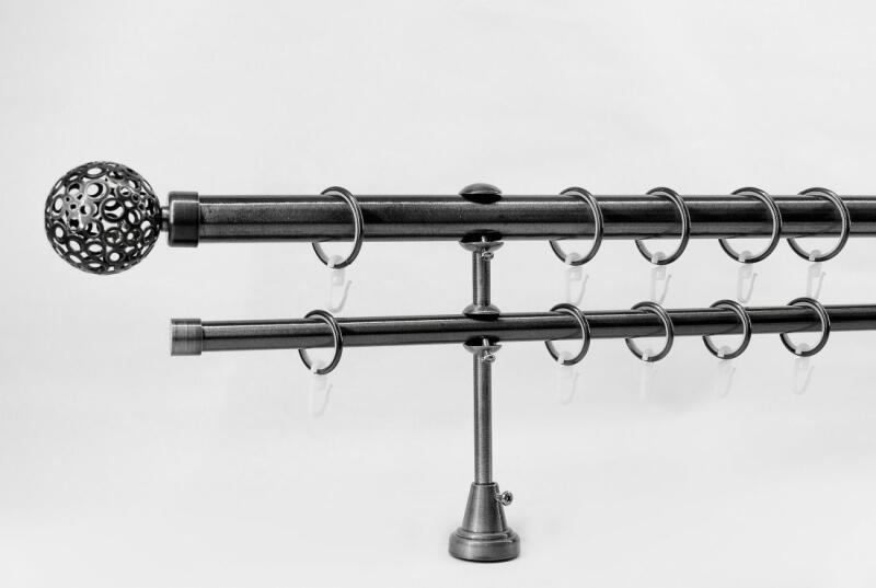 A szett tartalma: - 2 db nikkel-matt színű 19 mm Ø rúd a választott méretben - 2 db nikkel-matt Köln végzáró (2 cm) - 2 db nikkel- matt Köln végzáró (2 cm)- a hátsó rúdra - 2 db dupla nikkel-matt block tartó (12/18 cm) - nikkel-matt karikák ráncszedőkampóval (rudanként, 10 cm-ként 1 db) - a szereléshez szükséges csavarok és tiplik 240 cm karnishossz felett 3 db tartót