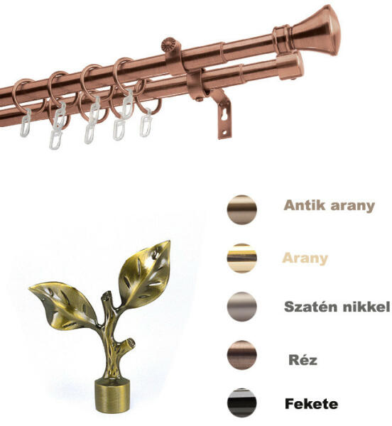 Teleszkópos fém karnis paramétereiRózsa levél végzáró hosszúsága14x12,5 cmColosseum végzáró hosszúsága5,2 x 3,5 cmFüggönyrúdak hossza160-310 cmFüggönyrúdak átmérőjeØ16-19