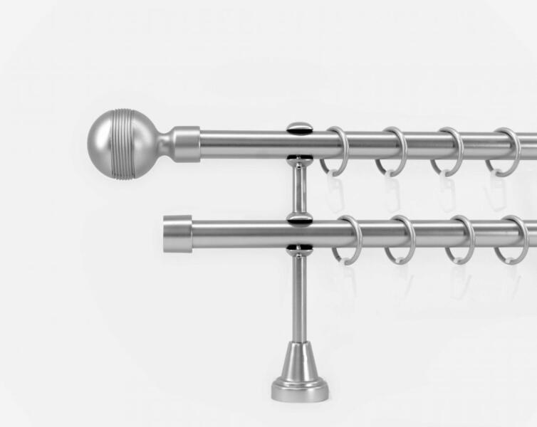 A szett tartalma: - 2 db nikkel-matt színű 19 mm Ø rúd a választott méretben - 2 db nikkel-matt Porto végzáró (7,5 cm) - 2 db nikkel- matt Köln végzáró (2 cm)- a hátsó rúdra - 2 db dupla nikkel-matt nyitott tartó (11/17 cm) - nikkel-matt karikák ráncszedőkampóval (rudanként, 10 cm-ként 1 db) - a szereléshez szükséges csavarok és tiplik 240 cm karnishossz felett 3 db tart