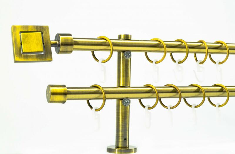 A szett tartalma: - 2 db óarany színű 16 mm Ø rúd a választott méretben - 2 db óarany Chicago végzáró (7 cm) - 2 db óarany Kansas végzáró (2 cm)- a hátsó rúdra - 2 db dupla óarany block tartó (8/14 cm) - óarany karikák és ráncszedő kampók (rudanként, 10 cm-ként 1 db) - a szereléshez szükséges csavarok és tiplik 240 cm karnishossz felett 3 db tartót tartalmaz a csom