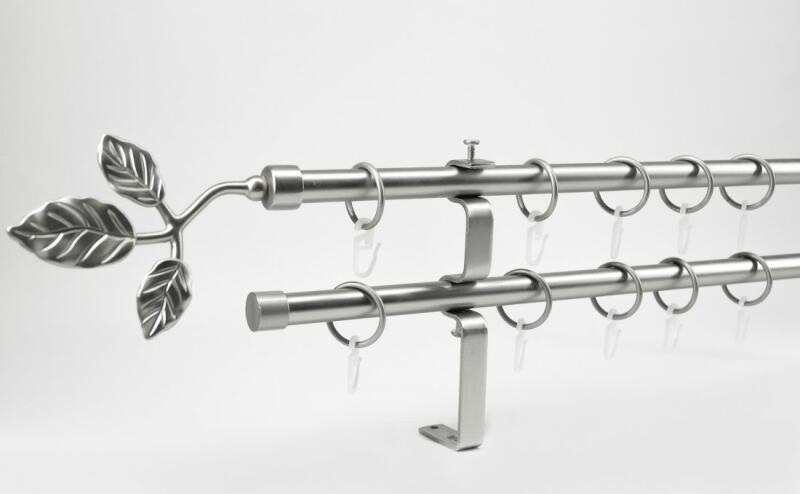 A szett tartalma: - 2 db nikkel-matt színű 16 mm Ø rúd a választott méretben - 2 db nikkel-matt Tata végzáró (13 cm) - 2 db nikkel- matt Kansas végzáró (2 cm)- a hátsó rúdra - 2 db dupla nikkel-matt lapostartó (8,5/14,5 cm) - nikkel-matt karikák ráncszedőkampóval (rudanként, 10 cm-ként 1 db) - a szereléshez szükséges csavarok és tiplik 240 cm karnishossz felett 3 db tart