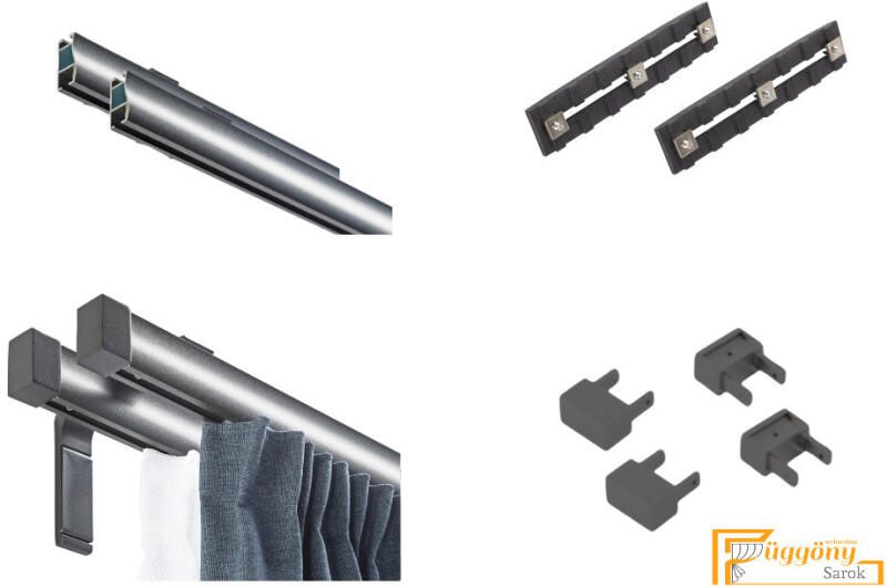 A szett tartalma: - 2 db óarany színű 16 mm Ø rúd a választott méretben - 2 db óarany Veszprém végzáró (2,5 cm) - 2 db óarany Kansas végzáró (2 cm)- a hátsó rúdra - 2 db dupla óarany lapostartó (8,5/14,5 cm) - óarany karikák és ráncszedő kampók (rudanként, 10 cm-ként 1 db) - a szereléshez szükséges csavarok és tiplik 240 cm karnishossz felett 3 db tartót tartalmaz