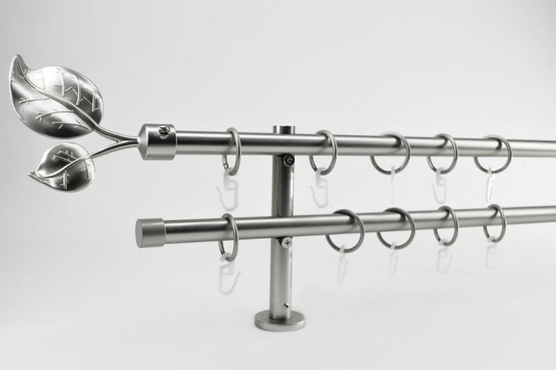 A szett tartalma: - 2 db nikkel-matt színű 16 mm Ø rúd a választott méretben - 2 db nikkel-matt San Marino végzáró (6,5 cm) - 2 db nikkel- matt Kansas végzáró (2 cm)- a hátsó rúdra - 2 db dupla nikkel-matt nyitott tartó (11,5/17,5 cm) - nikkel-matt karikák ráncszedőkampóval (rudanként, 10 cm-ként 1 db) - a szereléshez szükséges csavarok és tiplik 240 cm karnishossz felett