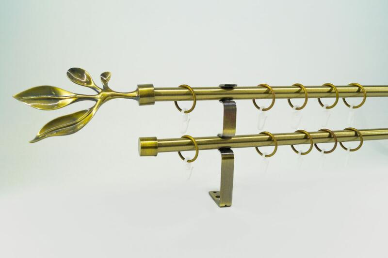 A szett tartalma: - 2 db óarany színű 16 mm Ø rúd a választott méretben - 2 db óarany Dublin végzáró (14 cm) - 2 db óarany Kansas végzáró (2 cm)- a hátsó rúdra - 2 db dupla óarany lapostartó (8,5/14,5 cm) - óarany karikák és ráncszedő kampók (rudanként, 10 cm-ként 1 db) - a szereléshez szükséges csavarok és tiplik 240 cm karnishossz felett 3 db tartót tartalmaz a c