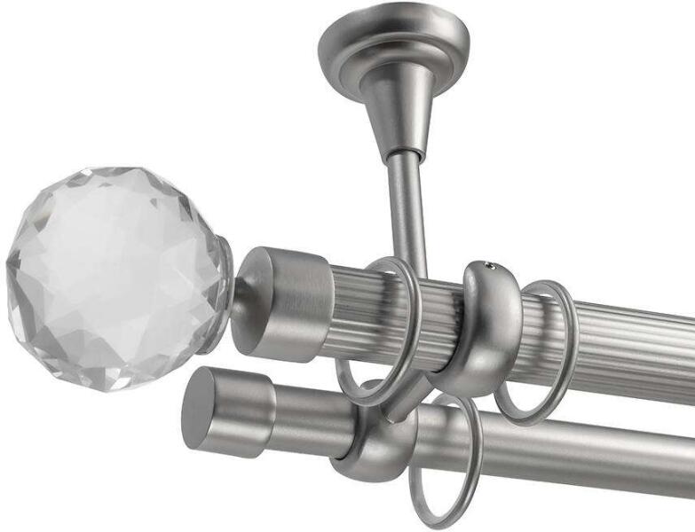 A szett tartalma: - 2 db nikkel-matt színű 16 mm Ø rúd a választott méretben - 2 db nikkel-matt Siófok végzáró (9 cm) - 2 db nikkel- matt Kansas végzáró (2 cm)- a hátsó rúdra - 2 db dupla nikkel-matt nyitott tartó (11,5/17,5 cm) - nikkel-matt karikák ráncszedőkampóval (rudanként, 10 cm-ként 1 db) - a szereléshez szükséges csavarok és tiplik 240 cm karnishossz felett 3 db