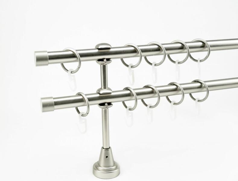 A szett tartalma: - 2 db nikkel-matt színű 16 mm Ø rúd a választott méretben - 2 db nikkel-matt San Marino végzáró (6,5 cm) - 2 db nikkel- matt Kansas végzáró (2 cm)- a hátsó rúdra - 2 db dupla nikkel-matt block tartó (8/14 cm) - nikkel-matt karikák ráncszedőkampóval (rudanként, 10 cm-ként 1 db) - a szereléshez szükséges csavarok és tiplik 240 cm karnishossz felett 3 db t