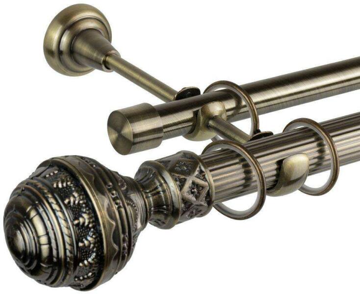 A szett tartalma: - 2 db óarany színű 19 mm Ø rúd a választott méretben - 2 db óarany Porto végzáró (7,5 cm) - 2 db óarany Köln végzáró (2 cm)- a hátsó rúdra - 2 db dupla óarany nyitott tartó (11/17 cm) - óarany karikák ráncszedőkampóval (rudanként, 10 cm-ként 1 db) - a szereléshez szükséges csavarok és tiplik 240 cm karnishossz felett 3 db tartót tartalmaz a csoma