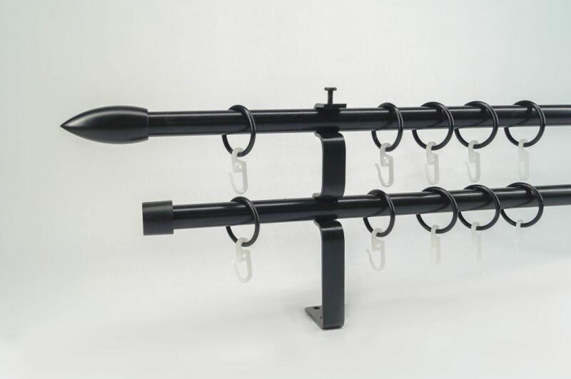 A szett tartalma: - 2 db fekete színű 16 mm Ø rúd a választott méretben - 2 db fekete Sopron végzáró (12 cm) - 2 db fekete Kansas végzáró (2 cm)- a hátsó rúdra - 2 db dupla fekete lapostartó (8,5/14,5 cm) - fekete karikák és ráncszedő kampók (rudanként, 10 cm-ként 1 db) - a szereléshez szükséges csavarok és tiplik 240 cm karnishossz felett 3 db tartót tartalmaz a csomag