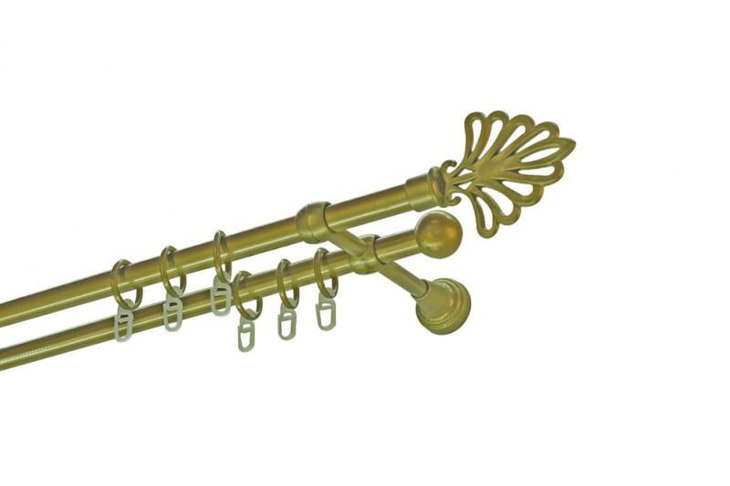 A szett tartalma: - 2 db óarany színű 16 mm Ø rúd a választott méretben - 2 db óarany Washington végzáró (10 cm) - 2 db óarany Kansas végzáró (2 cm)- a hátsó rúdra - 2 db dupla óarany lapostartó (8,5/14,5 cm) - óarany karikák és ráncszedő kampók (rudanként, 10 cm-ként 1 db) - a szereléshez szükséges csavarok és tiplik 240 cm karnishossz felett 3 db tartót tartalmaz