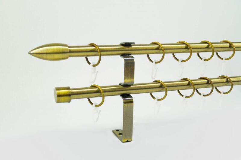 A szett tartalma: - 2 db óarany színű 16 mm Ø rúd a választott méretben - 2 db óarany Memphis végzáró (5,5 cm) - 2 db óarany Kansas végzáró (2 cm)- a hátsó rúdra - 2 db dupla óarany lapostartó (8,5/14,5 cm) - óarany karikák és ráncszedő kampók (rudanként, 10 cm-ként 1 db) - a szereléshez szükséges csavarok és tiplik 240 cm karnishossz felett 3 db tartót tartalmaz a