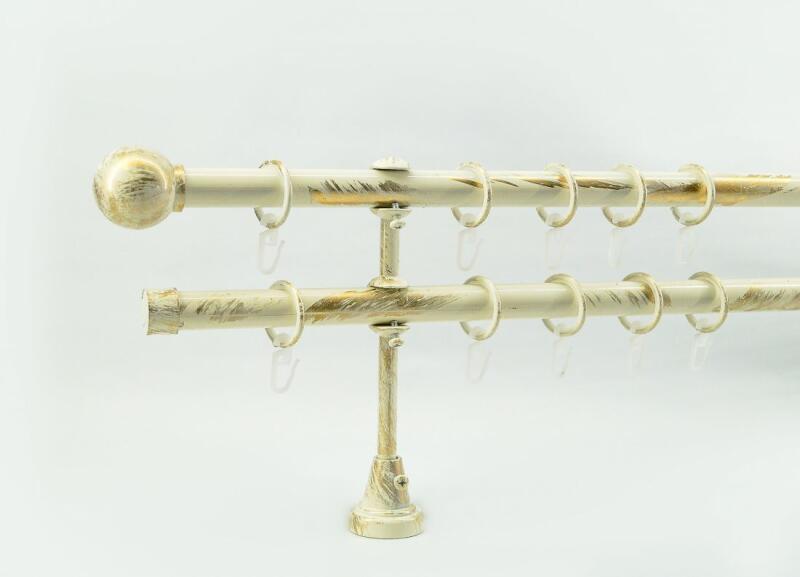 A szett tartalma: - 2 db ecrü-gold színű 19 mm Ø rúd a választott méretben - 2 db ecrü-gold Siena végzáró (4 cm) - 2 db ecrü-gold Arezzo végzáró (2 cm)- a hátsó rúdra - 2 db dupla ecrü-gold nyitott tartó (12/18 cm) - ecrü-gold karikák ráncszedőkampóval (rudanként, 10 cm-ként 1 db) - a szereléshez szükséges csavarok és tiplik 240 cm karnishossz felett 3 db tartót tar