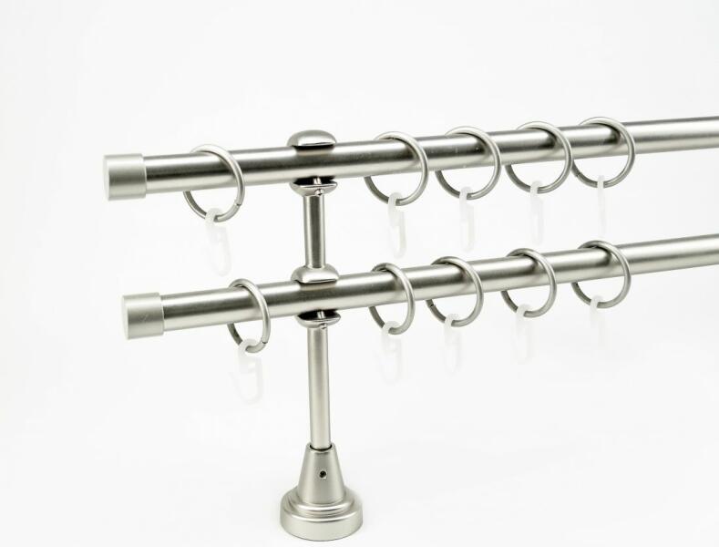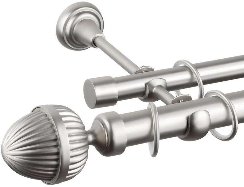 A szett tartalma: - 2 db nikkel-matt színű 19 mm Ø rúd a választott méretben - 2 db nikkel-matt Köln végzáró (2 cm) - 2 db nikkel- matt Köln végzáró (2 cm)- a hátsó rúdra - 2 db dupla nikkel-matt nyitott tartó (11/17 cm) - nikkel-matt karikák ráncszedőkampóval (rudanként, 10 cm-ként 1 db) - a szereléshez szükséges csavarok és tiplik 240 cm karnishossz felett 3 db tartó