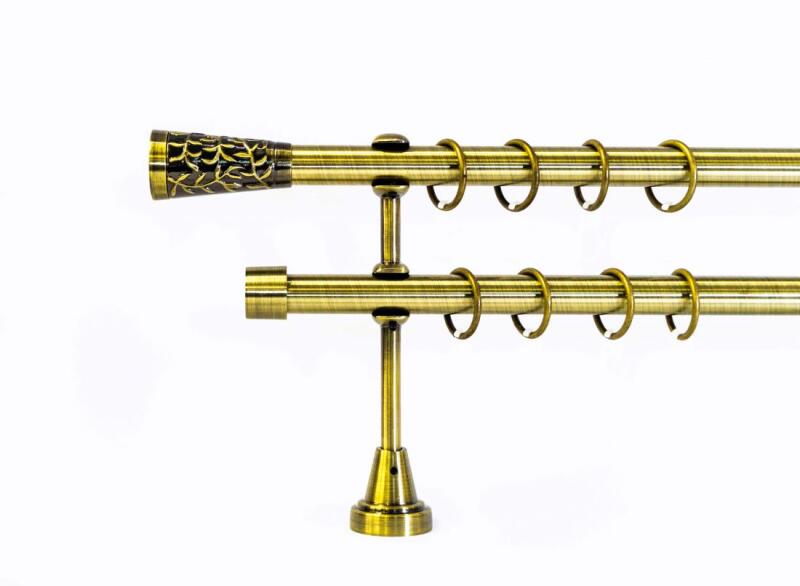 A szett tartalma: - 2 db óarany színű 19 mm Ø rúd a választott méretben - 2 db óarany Belgrad végzáró (7 cm) - 2 db óarany Köln végzáró (2 cm)- a hátsó rúdra - 2 db dupla óarany nyitott tartó (11/17 cm) - óarany karikák ráncszedőkampóval (rudanként, 10 cm-ként 1 db) - a szereléshez szükséges csavarok és tiplik 240 cm karnishossz felett 3 db tartót tartalmaz a csoma