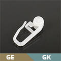 Függöny görgő, akasztóval a GE és GK műanyag mennyezeti sínekhez. Az akasztós görgőt guri, függönyhorog néven is ismerik. A műanyag görgőt leginkább ráncolószalaggal készült, behúzószalagos függönyökhöz szokták használni - a görgős akasztók kampóit a ráncoló fülecskéibe kell akasztani. Függönyök rögzítéseA csúszkás akasztóval (függöny akasztó) kön